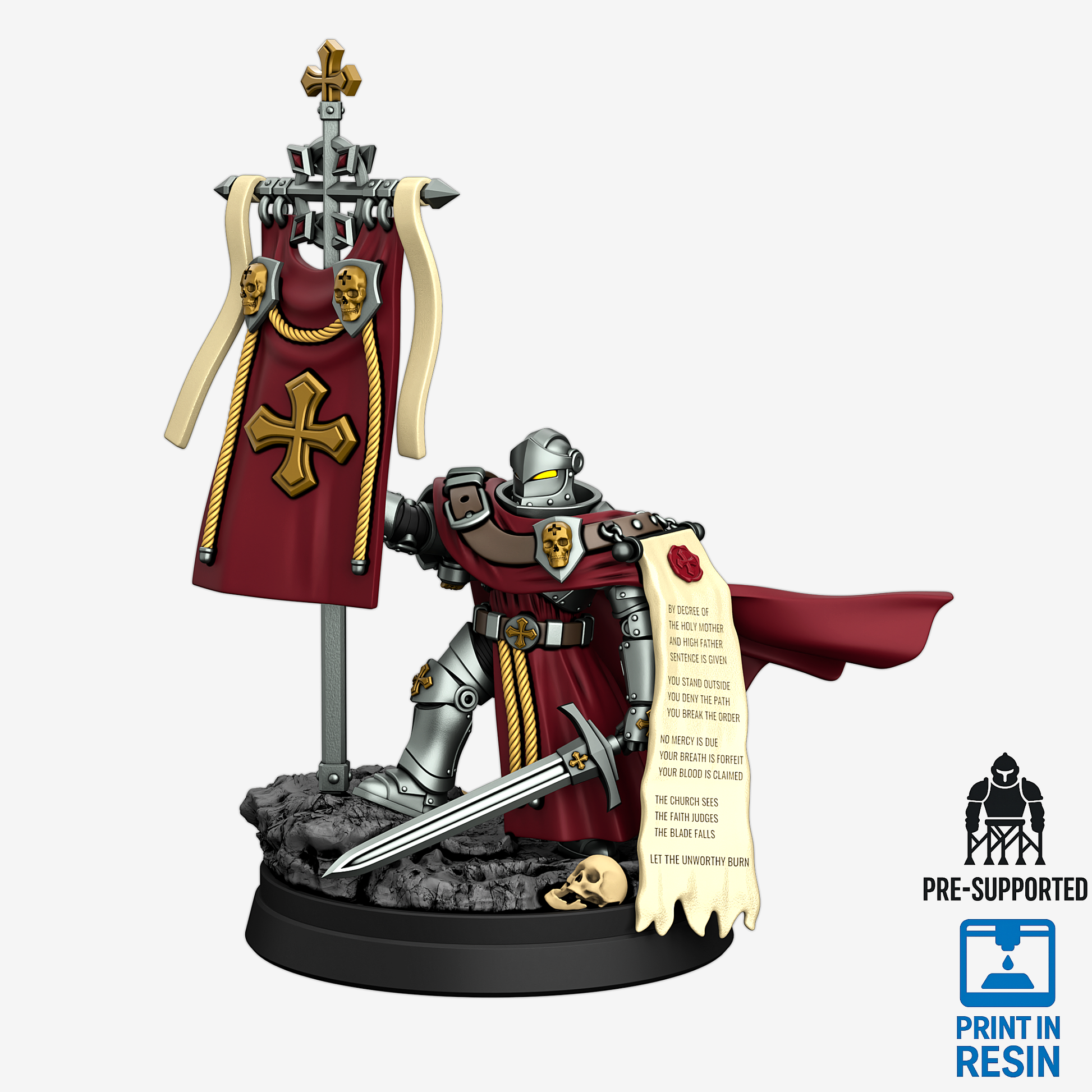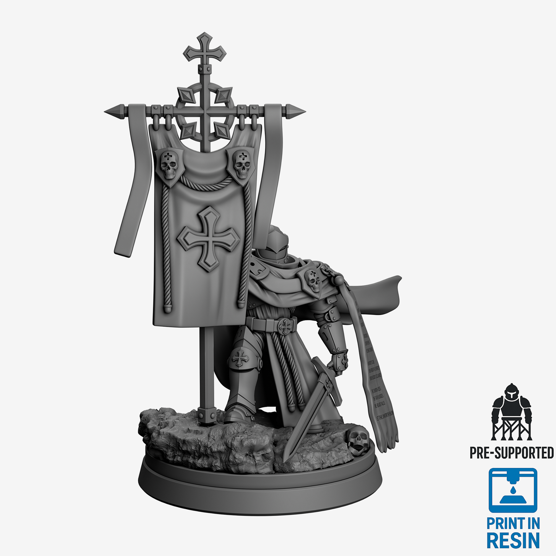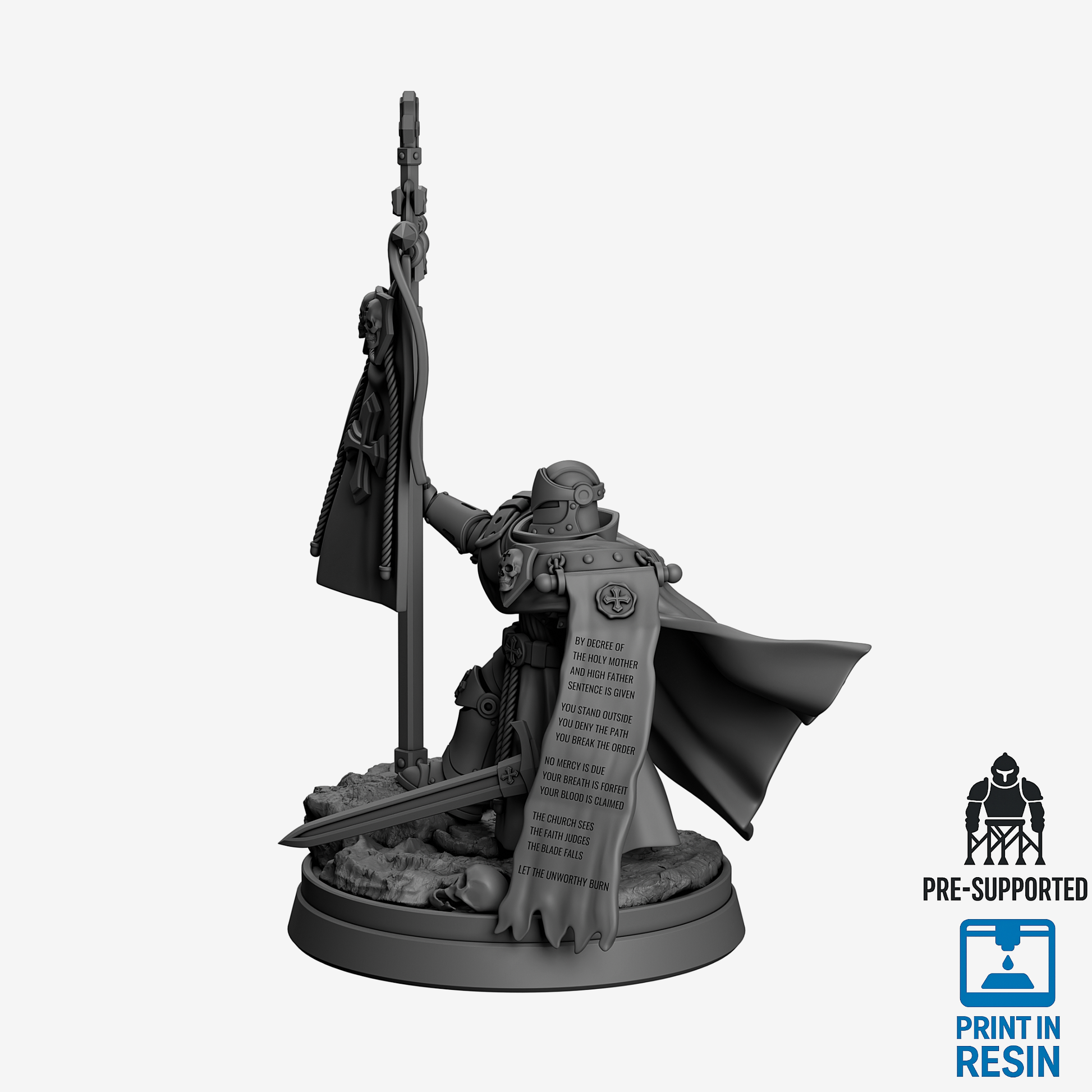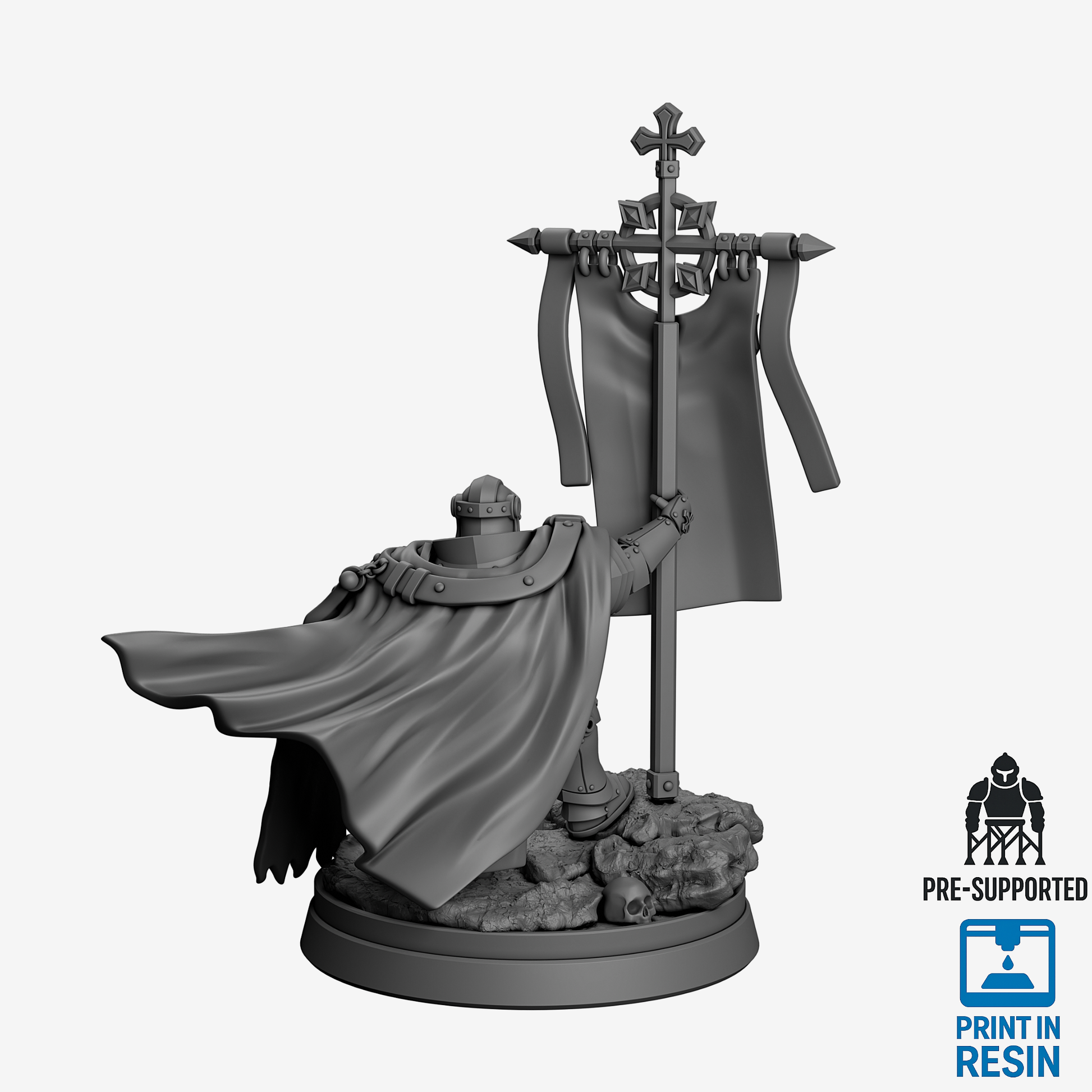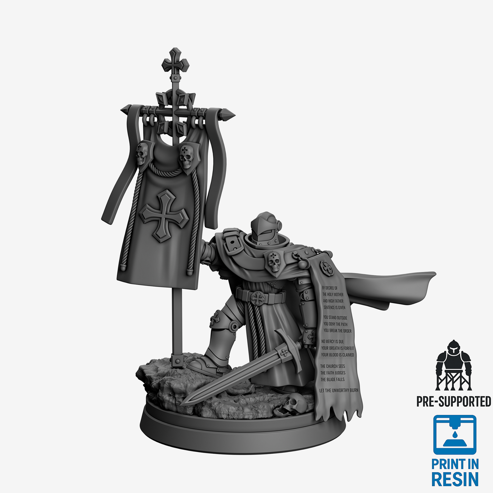 The Exalted Bannerman – Herald Loadout is a Support unit of the Exalted Crusade. This 32mm heroic-scale miniature is equipped with a Longsword and is provided in 11 parts for easy printing and assembly.