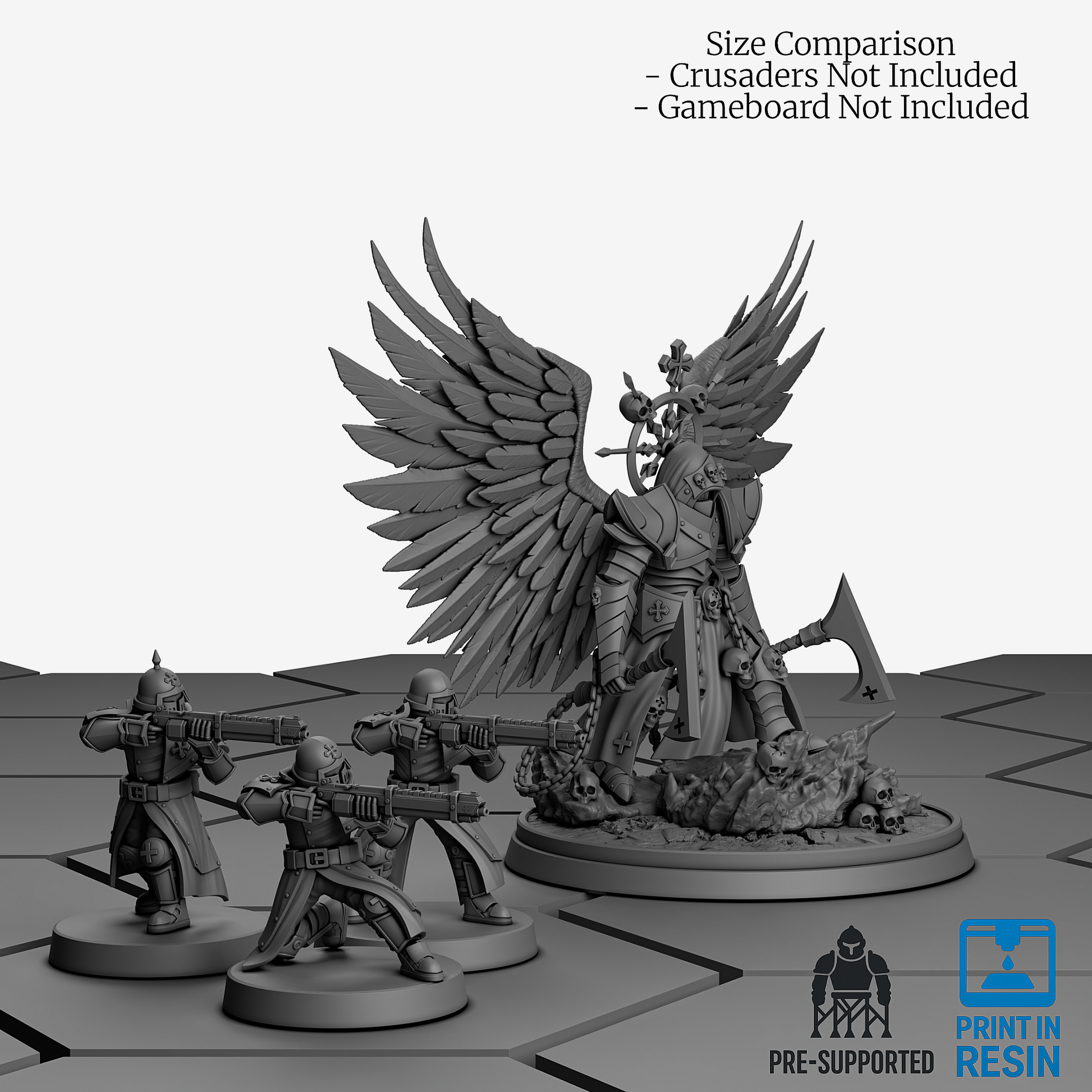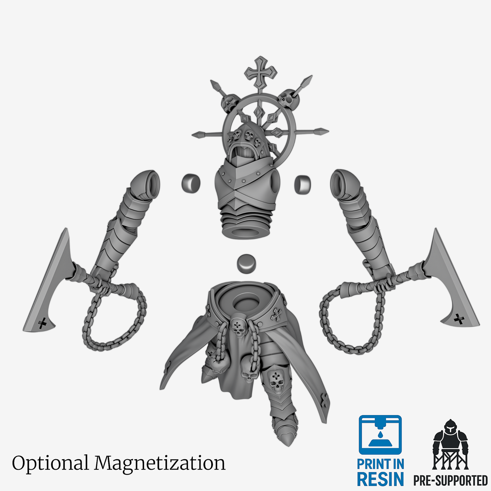 The Exalted Harvester – Executioner Loadout is a Monstrous unit of the Exalted Crusade. This 32mm heroic-scale miniature is equipped with Dual Cleavers and is provided in 21 parts for easy printing and assembly.