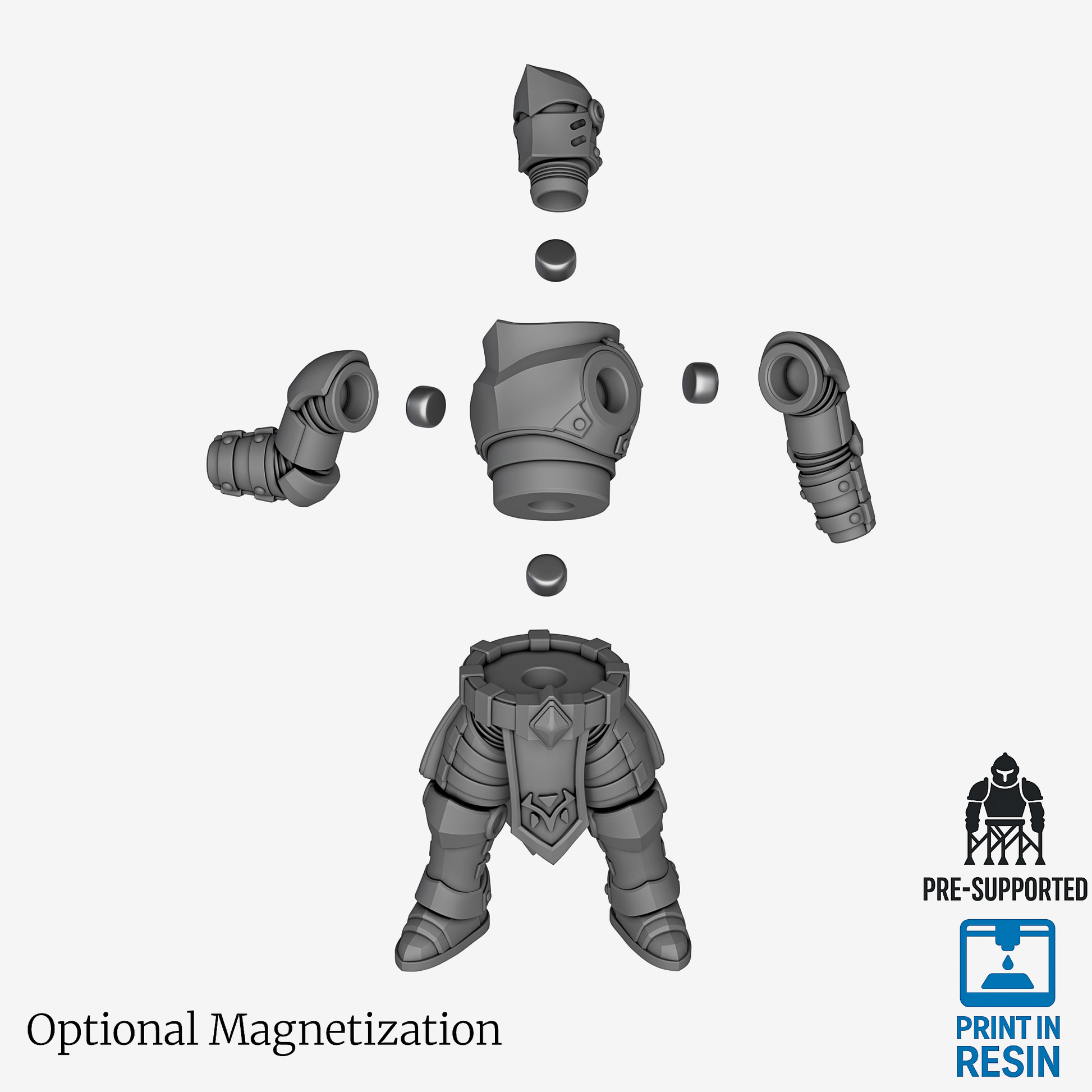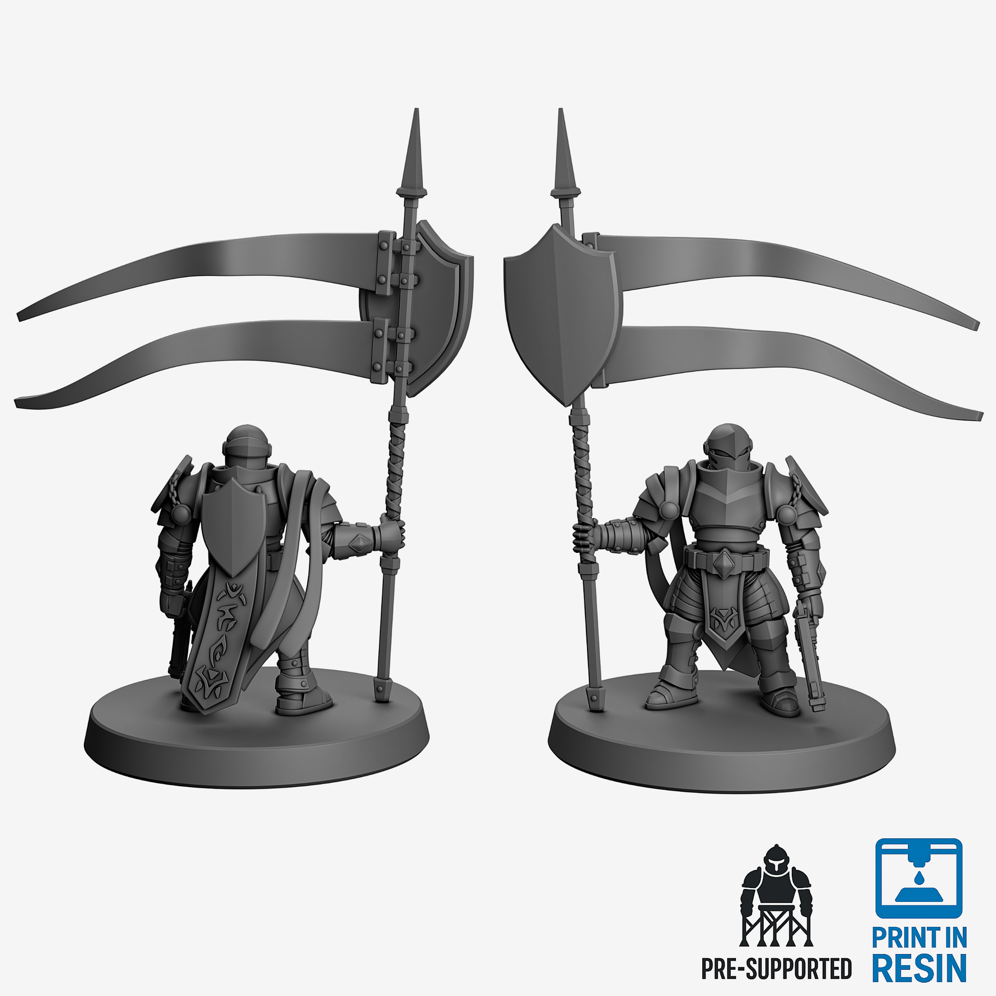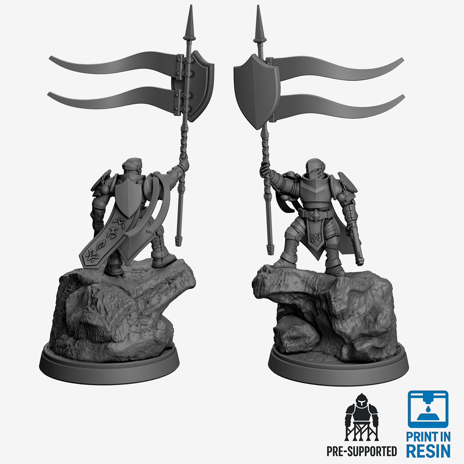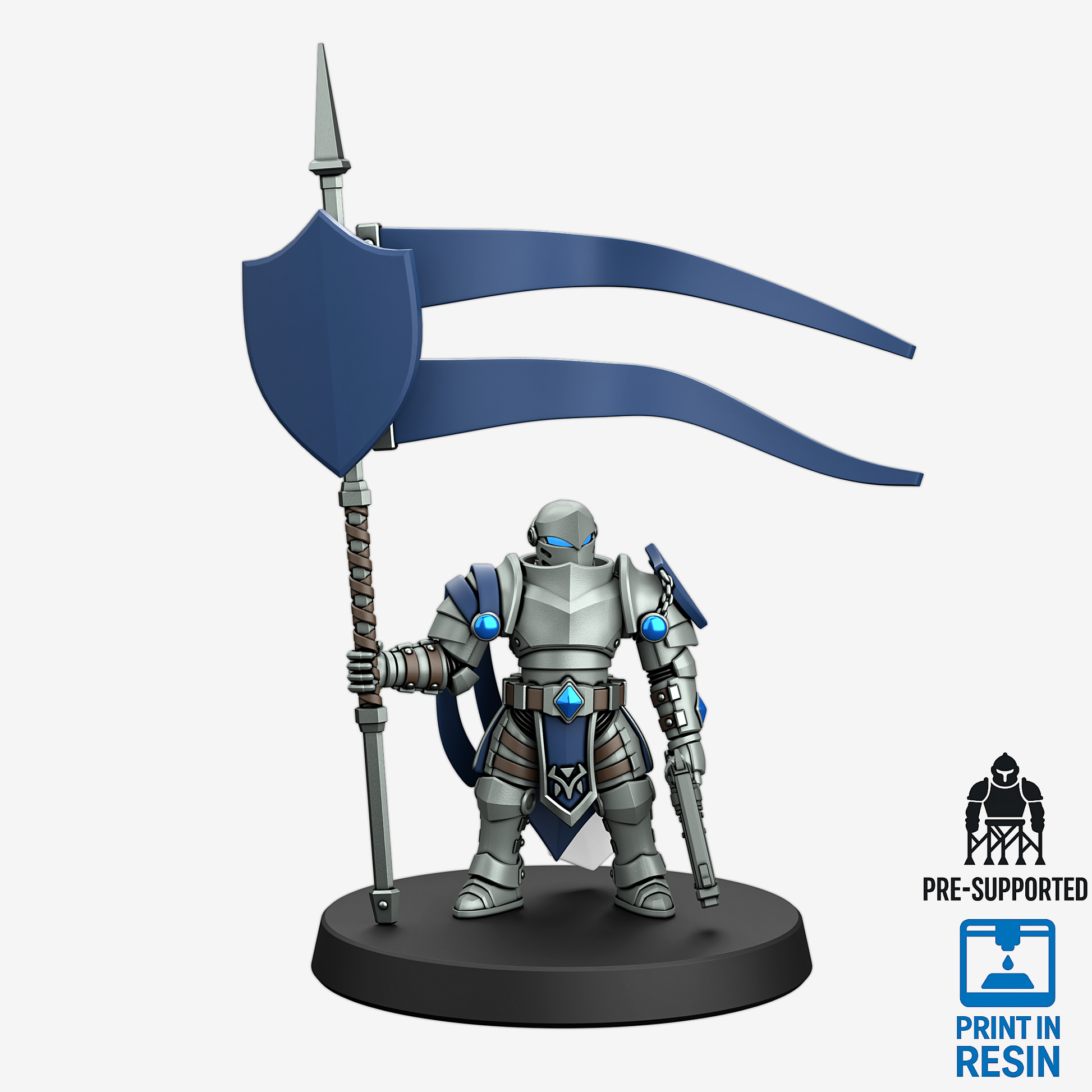 The Lorian Bannerman - Bannerguard Loadout is a Support unit of the Lorian Knight Order. This 32mm heroic-scale miniature is equipped with a Handcannon and is provided in 20 parts for easy printing and assembly.