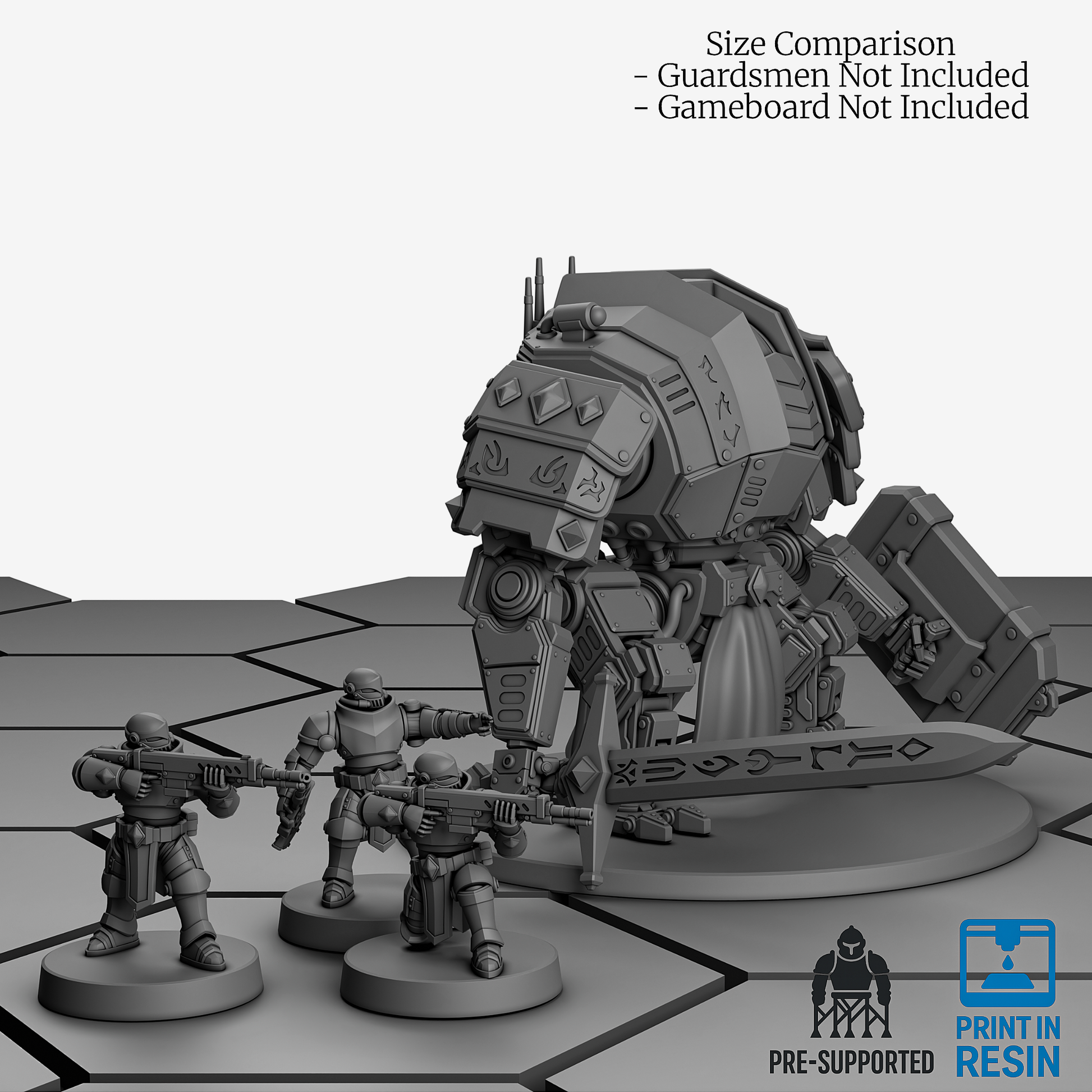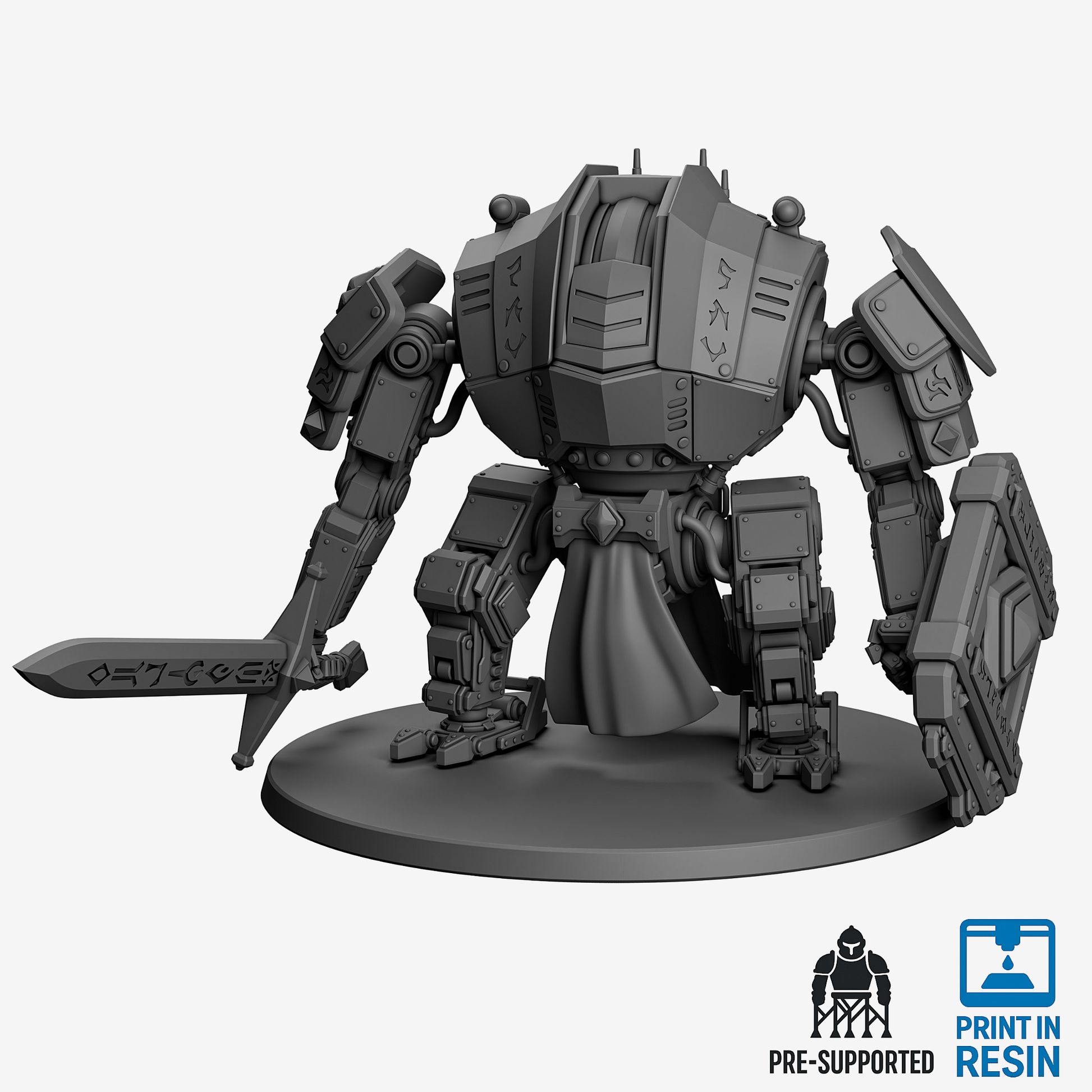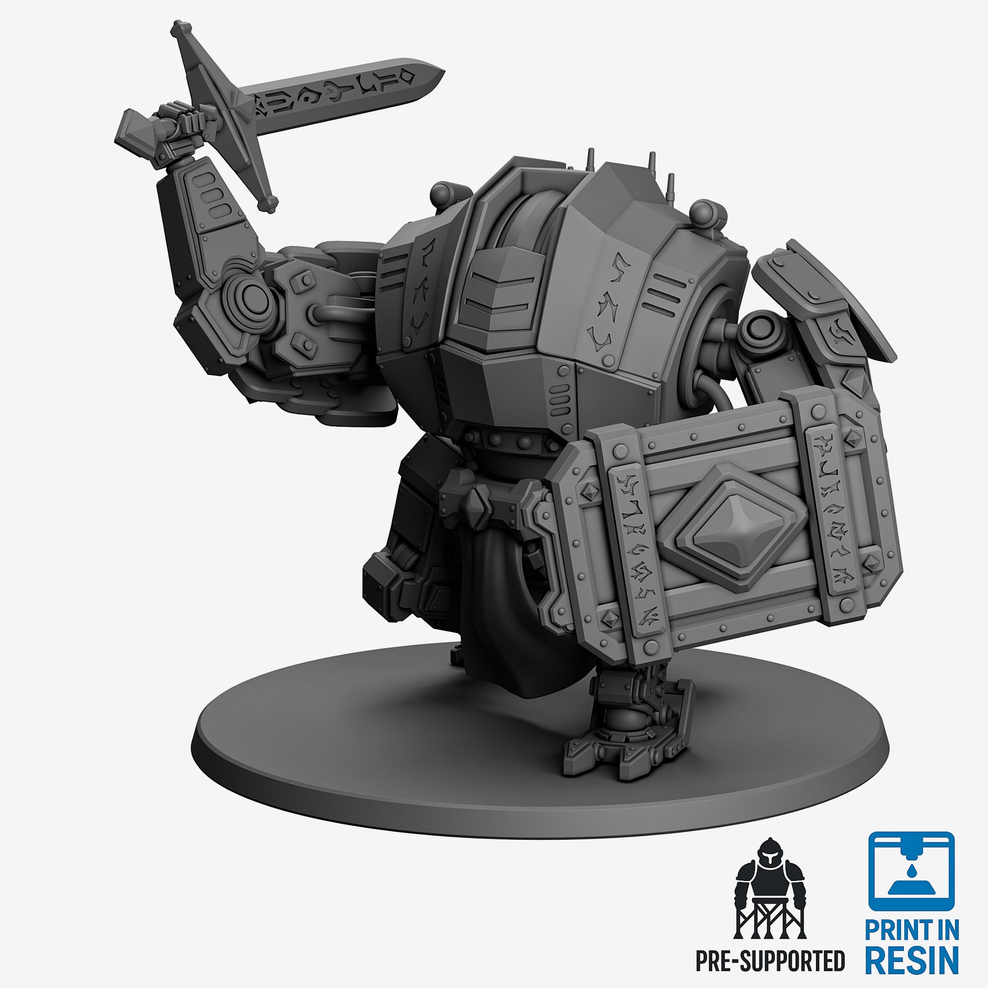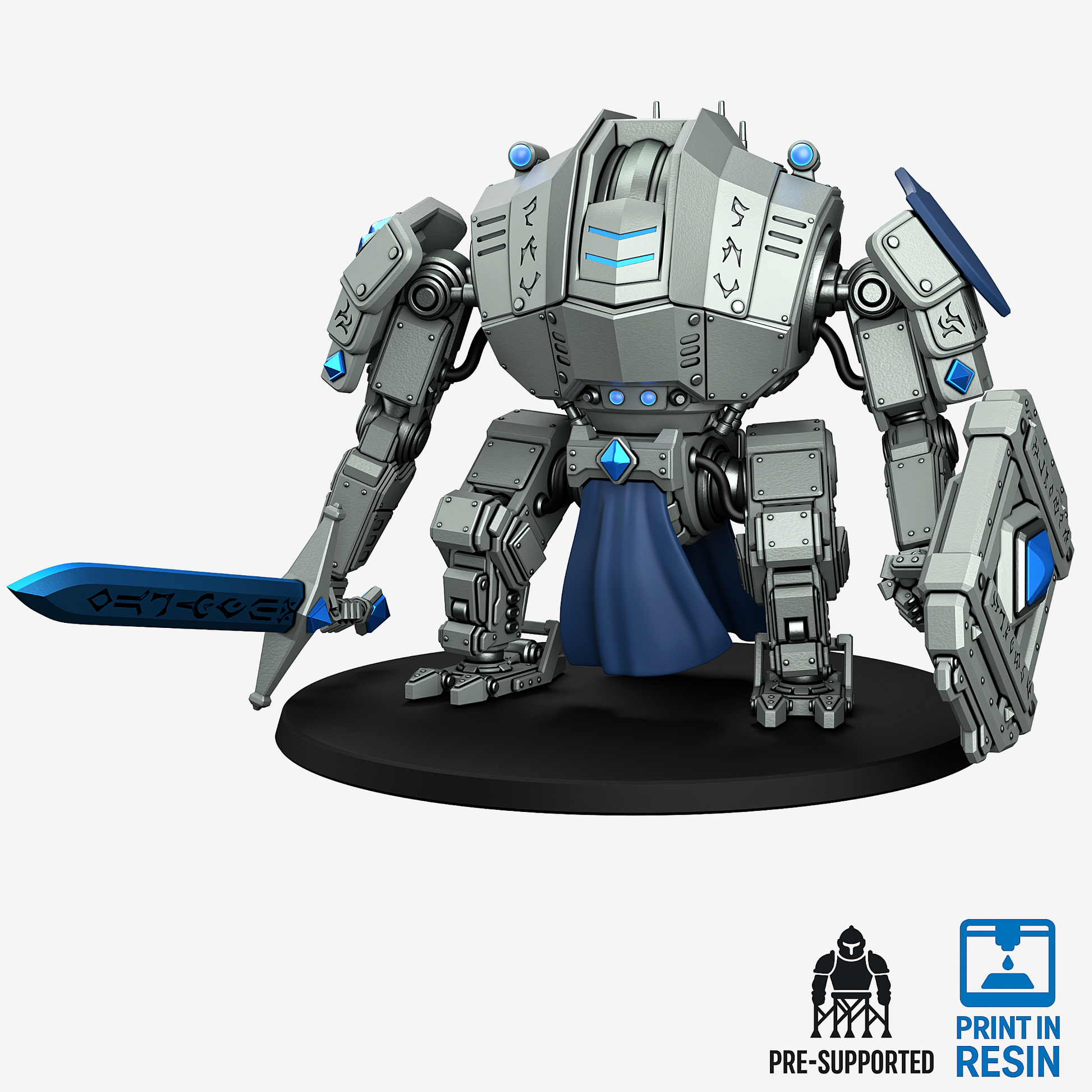 The Lorian Ironclad - Dreadnought Loadout is a Vehicle unit of the Lorian Knight Order. This 32mm heroic-scale miniature is equipped with a Runic Longsword & Shield and is provided in 18 parts for easy printing and assembly.
