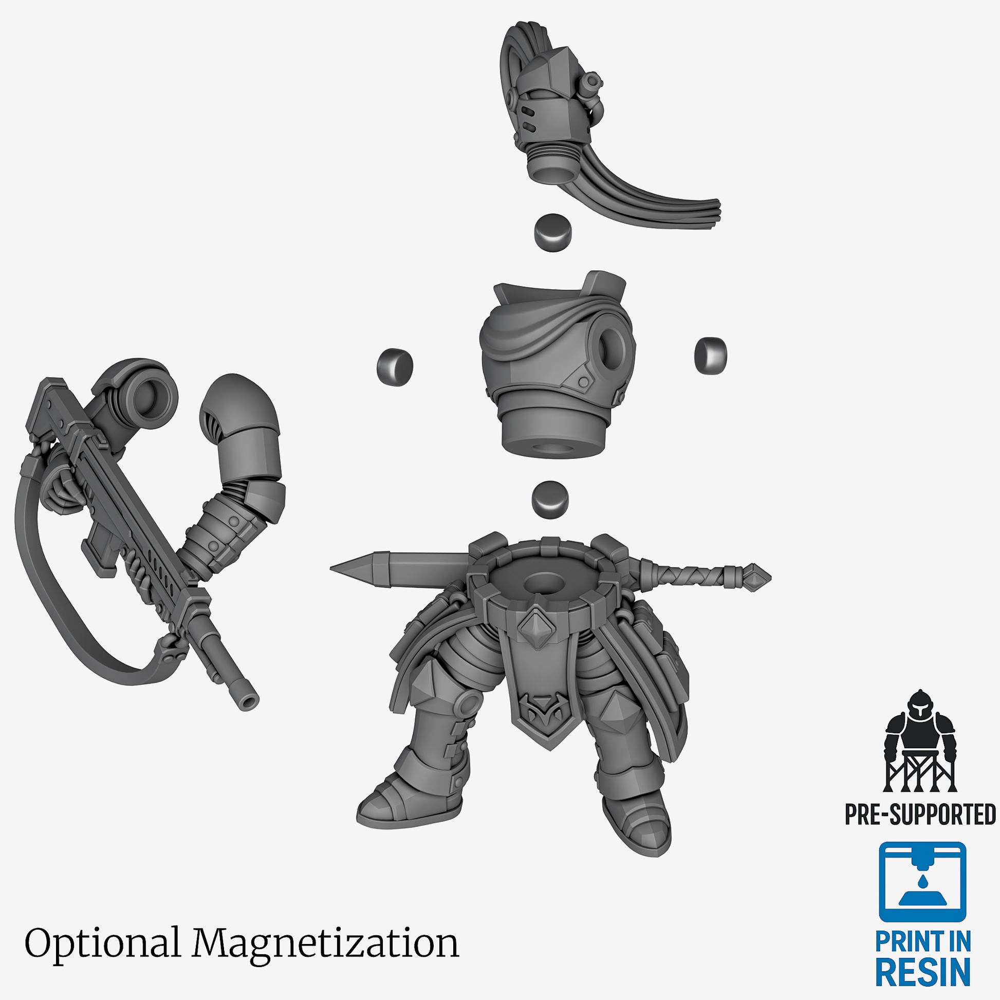 Ranger-Captain Myros is equipped with his Marksman Loadout and serves as a Captain of the Lorian Knight Order. This 32mm heroic-scale miniature is equipped with a Light Mana Rifle and is provided in 14 parts for easy printing and assembly.